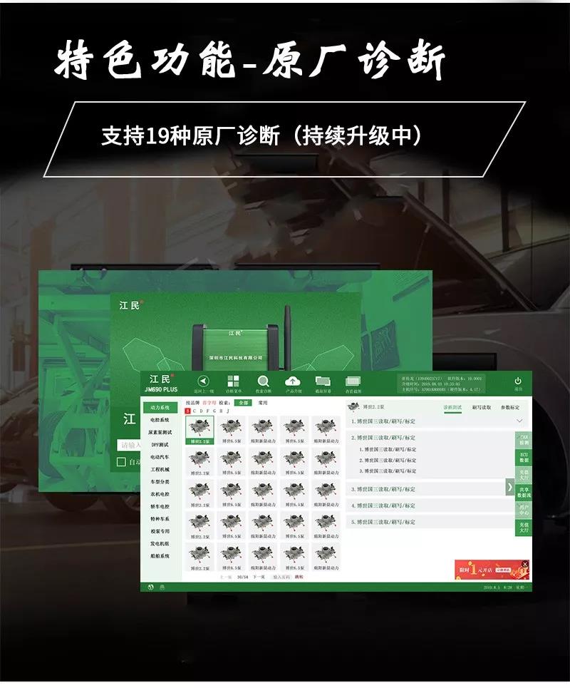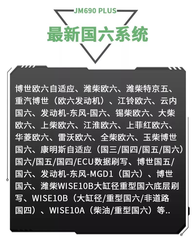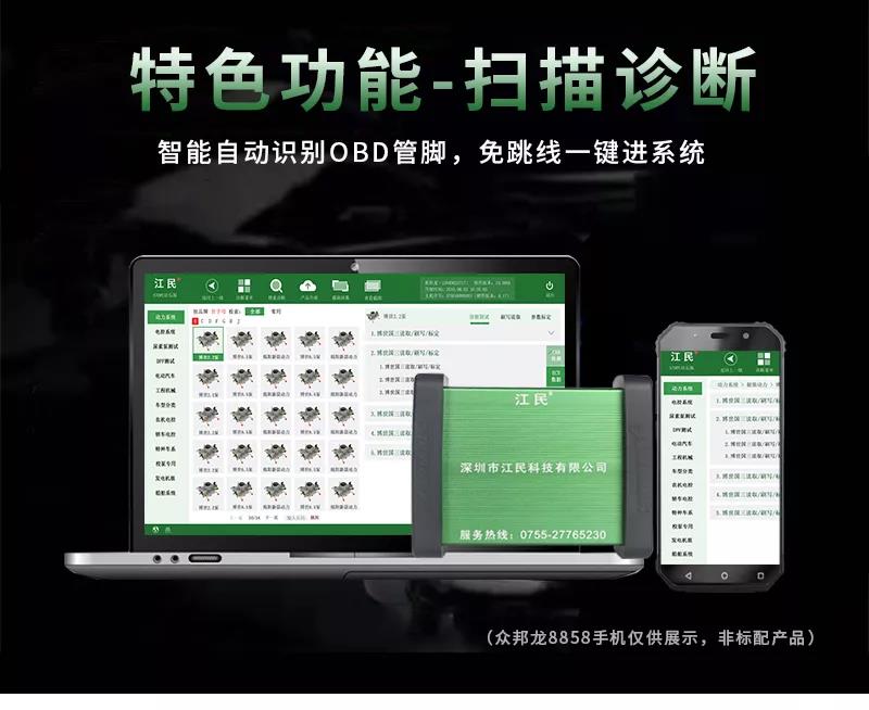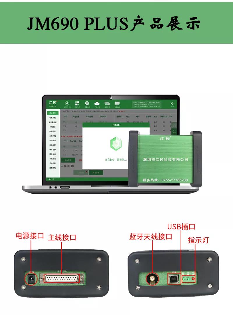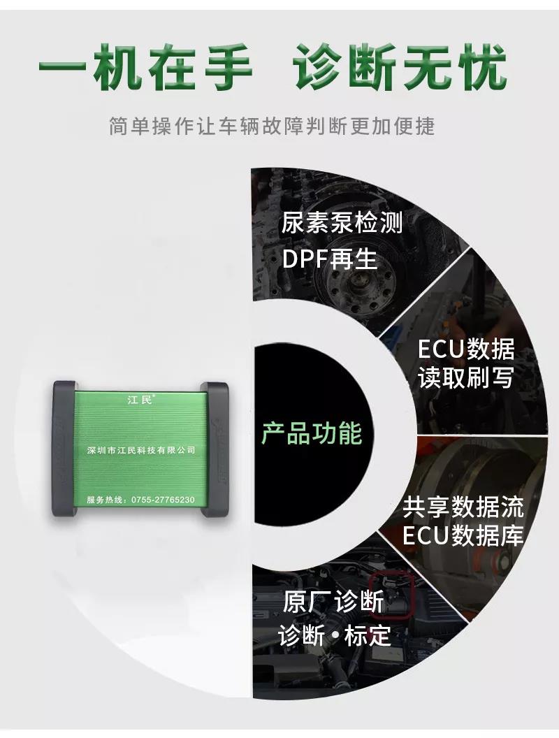 江民690plus綜合版柴油動(dòng)力診斷儀是專為柴油車維修廠量身定做的一款智能型多功能綜合性診斷設(shè)備,該診斷儀可以檢測(cè)市面上包括卡車,客車,皮卡,SUV,工程機(jī)械車輛及輪船,發(fā)電機(jī)組,農(nóng)業(yè)機(jī)械等各類柴油動(dòng)力,同時(shí)兼顧C(jī)NG/LNG車輛的故障診斷,可以輕松實(shí)現(xiàn)讀取故障碼,清除故障碼,讀數(shù)據(jù)流,元器件測(cè)試,標(biāo)定發(fā)動(dòng)機(jī)參數(shù)及修改ECU數(shù)據(jù)等,并且除檢測(cè)發(fā)動(dòng)機(jī)外,還支持ABS/CBCU/AMT 等系統(tǒng)的故障檢測(cè)。配備品牌聯(lián)想筆記本電腦,軟件操作更流暢,兼具遠(yuǎn)程專家會(huì)診功能,隨時(shí)隨地聯(lián)上網(wǎng)絡(luò)即可遠(yuǎn)程協(xié)助解決各類疑難雜癥故障,一機(jī)在手師傅徒弟修車從此無憂,設(shè)備支持手機(jī)APP操作,且可以同時(shí)安裝五部手機(jī),任何一個(gè)工人帶著設(shè)備都可以修車,方便快捷江民690plus全有啦!