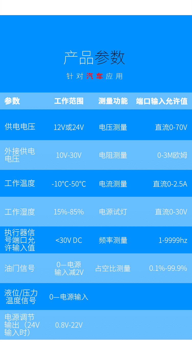 轉(zhuǎn)速信號(hào)、車速信號(hào)(霍爾、磁電、光電信號(hào))、ABS輪速信號(hào)、氧傳感器信號(hào)、節(jié)氣門信號(hào)、空氣流量計(jì)、進(jìn)氣壓力傳感器(模擬、數(shù)字)、爆震傳感器等信號(hào)模擬。